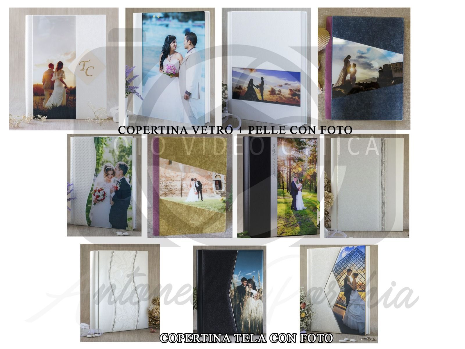 Ogni album viene rilegato a mano, garantendo cura e attenzione in ogni fase. Proponiamo diverse tipologie di copertine, studiate per adattarsi allo stile dell’evento e al gusto personale. Dalle soluzioni più classiche a quelle più moderne, ogni copertina può essere personalizzata anche con fotografie, dettagli grafici e finiture particolari.